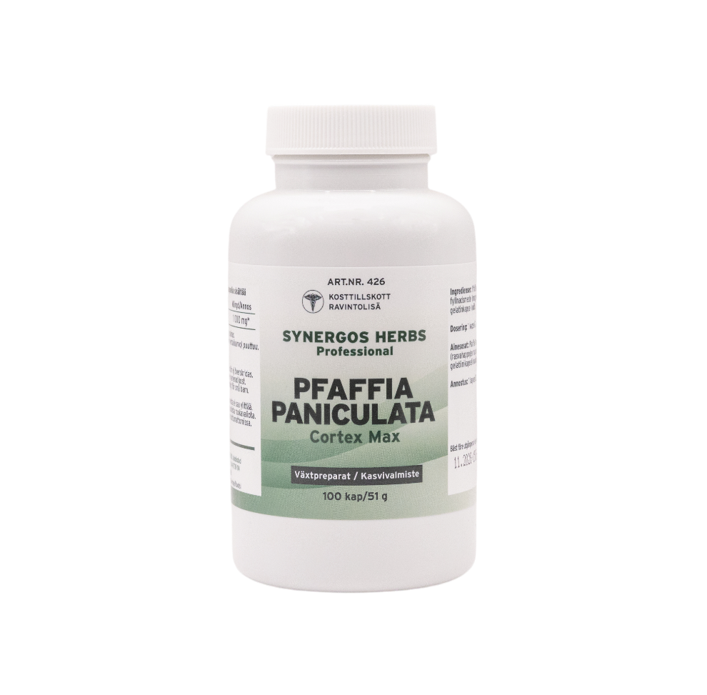 Ingredienser: Pfaffia Paniculata 4:1, fyllnadsmedel (magnesiumsalter av fettsyror), gelatinkapsel (nöt).