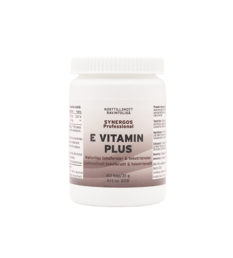 Produktinformation: E-vitamin Plus är ett avancerat kosttillskott som innehåller en bred sammansättning av naturliga tokoferoler. Varje kapsel innehåller 110 mg E-vitamin med naturliga tokoferoler och tokotrienoler varav 10 mg alfa tokoferol, 2 mg beta tokoferol, 27 mg delta tokoferol, 61 mg gamma tokoferol, 15 mg leucin, 10 mg tokotrienoler (alfa tokotrienoler, beta tokotrienoler, delta tokotrienoler och gamma tokotrienoler).