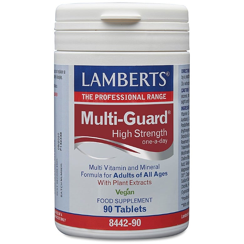 Multi-Guard® är en av de mest kompletta multivitamin/mineral tillskottet för vuxna som finns i Sverige. Många tillverkare fuskar och sänker ner doseringarna på multvitaminerna för att kunna producera dem billigt. Lamberts har valt att inte kompromissa utan tillverka en produkt med hög kvalite. Förutom höga doser B vitaminer innehåller även Multi-Guard de viktigaste antioxidanterna och mineraler samt spårämnen. Denna produkt lämpar sig bra som ett en-om-dagen kosttillskott för att försäkra sig att kroppen får de viktiga näringsämnen vi behöver.