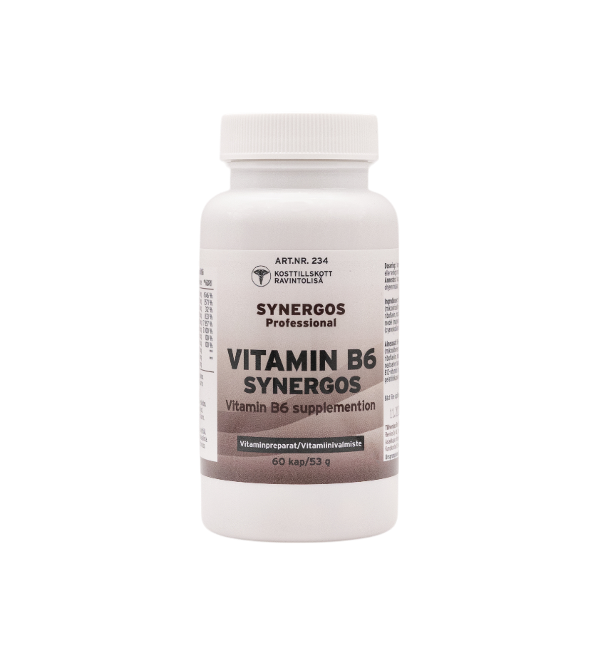 B6 – Pyridoxin Synergos är ett kosttillskott som innehåller vitamin B6. En bas av alla B-vitaminer med högre dos av vitamin B6.